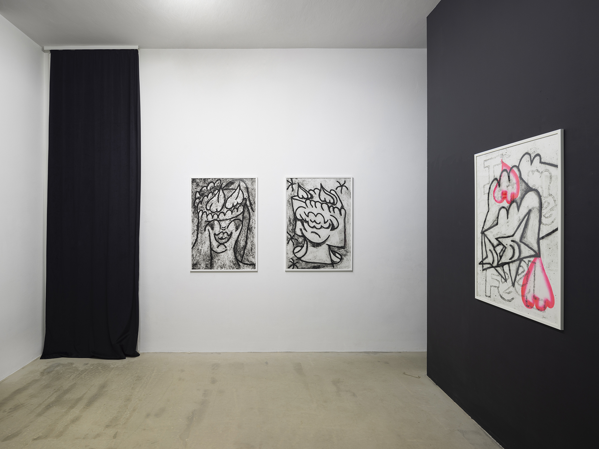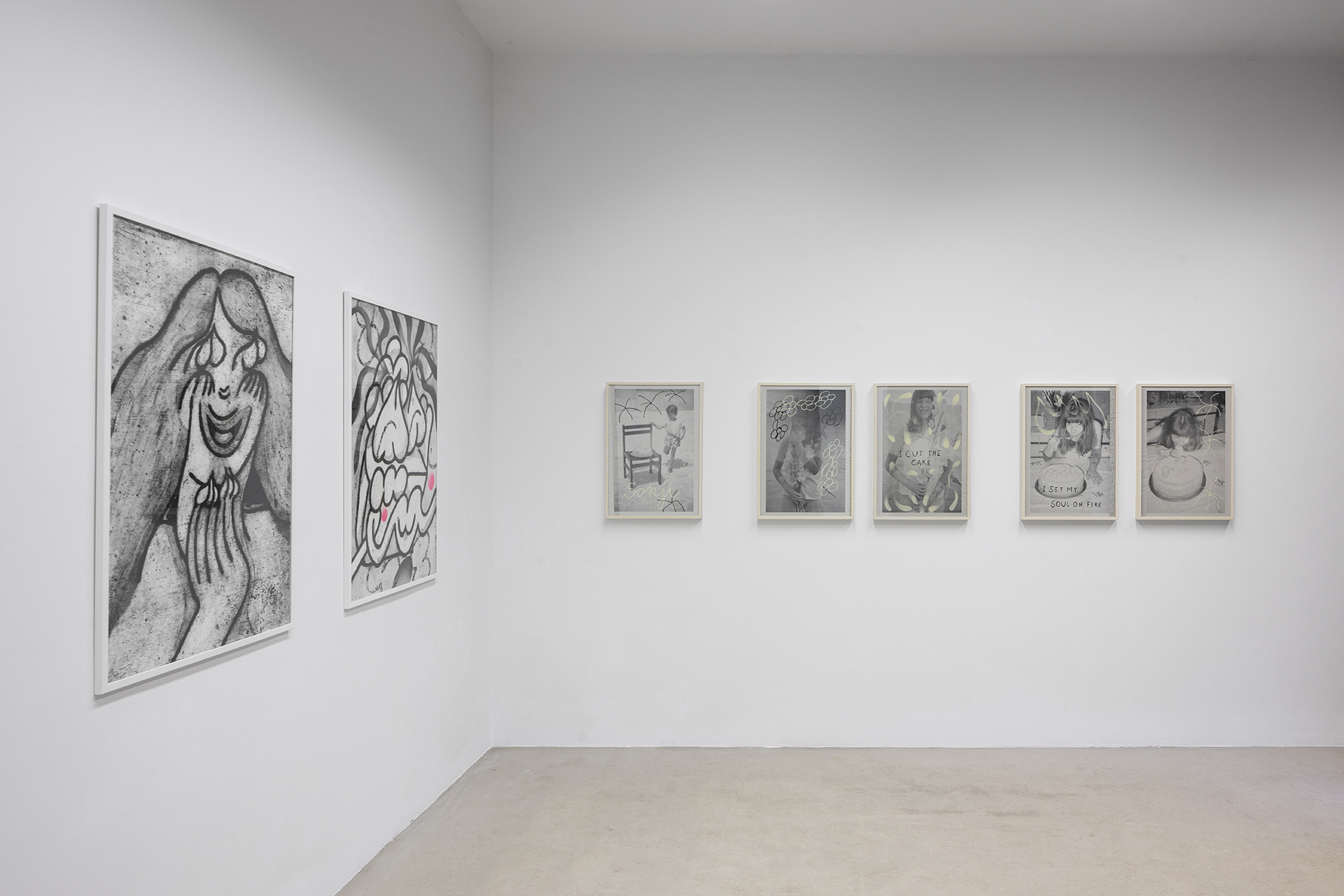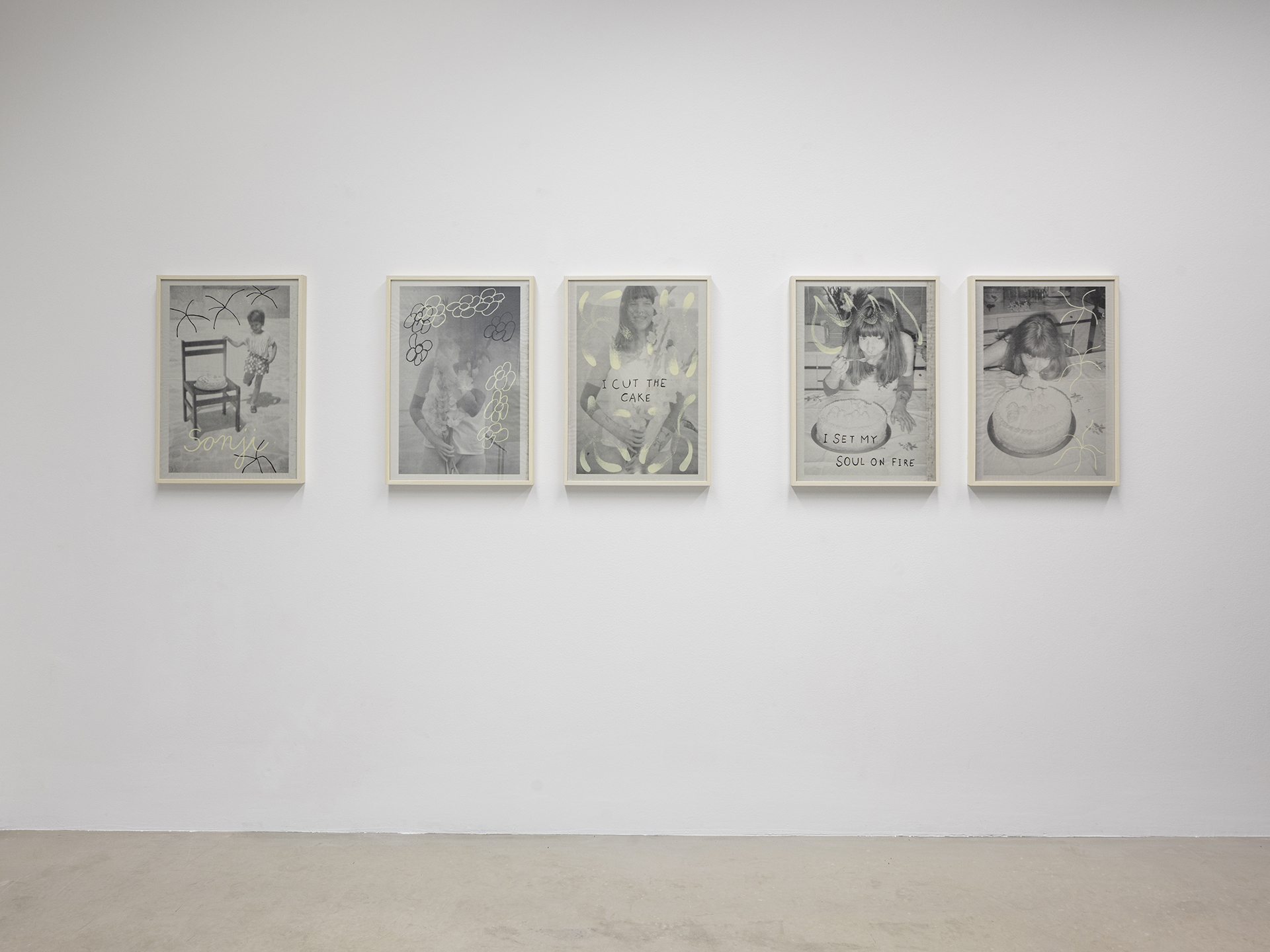 The series unfolds formally in two artistic and technical segments that complement each other. The first segment is based on analogue photographs transferred onto newsprint paper using the screen printing technique. The screen prints include current self-portraits and an archival photograph from the artist’s childhood. These intimate images are enhanced by drawing interventions and short phrases that serve as affirmations of her own empowerment.
